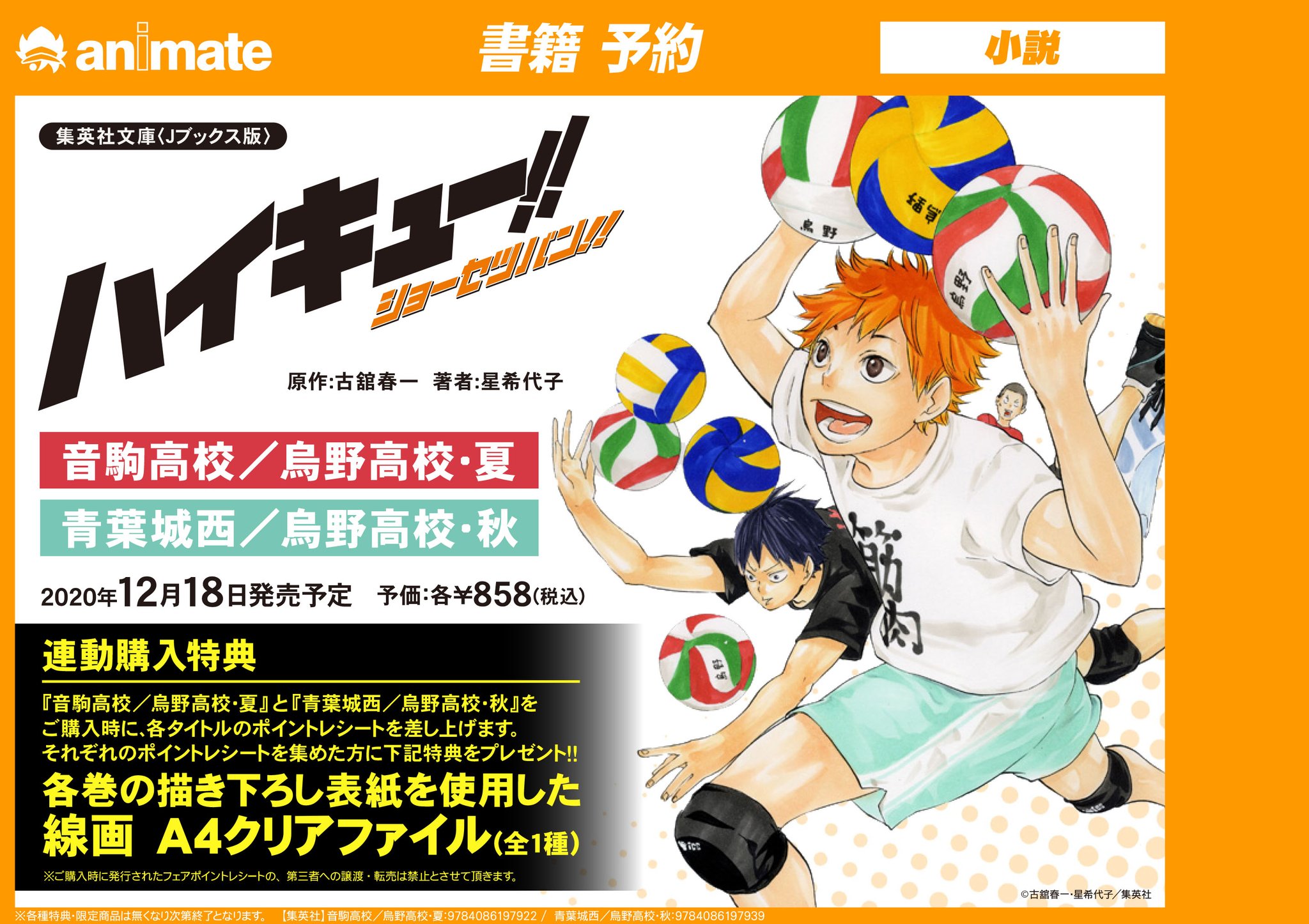 アニメイト 本チーム Twitterissa 集英社文庫 Jブックス版 ハイキュー ショーセツバン が11月から毎月2巻ずつ発売 アニメイトではそれぞれ連動特典として各巻の描き下ろし表紙を使用した 線画 クリアファイル がついてくる 無くなり次第終了なのでご